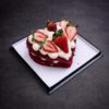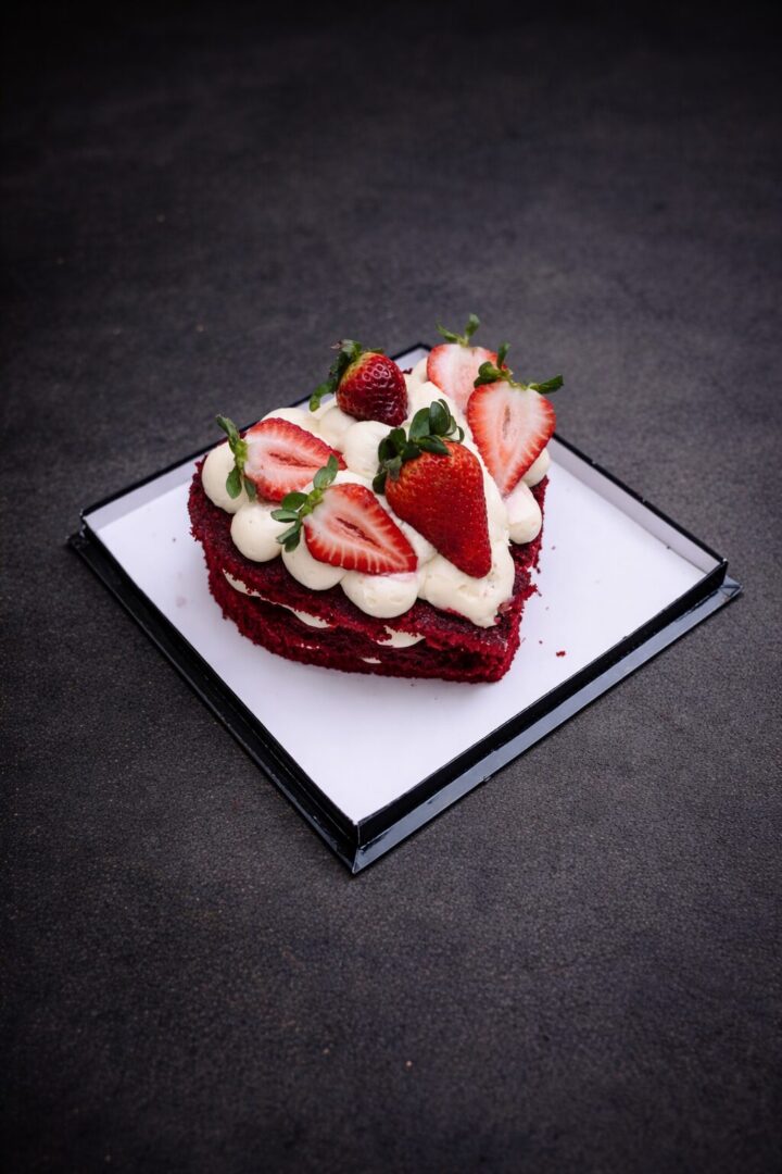 Torta en forma de corazón sabor Red Velvet o Terciopelo Rojo: bizcochuelo con cacao y relleno de queso crema.